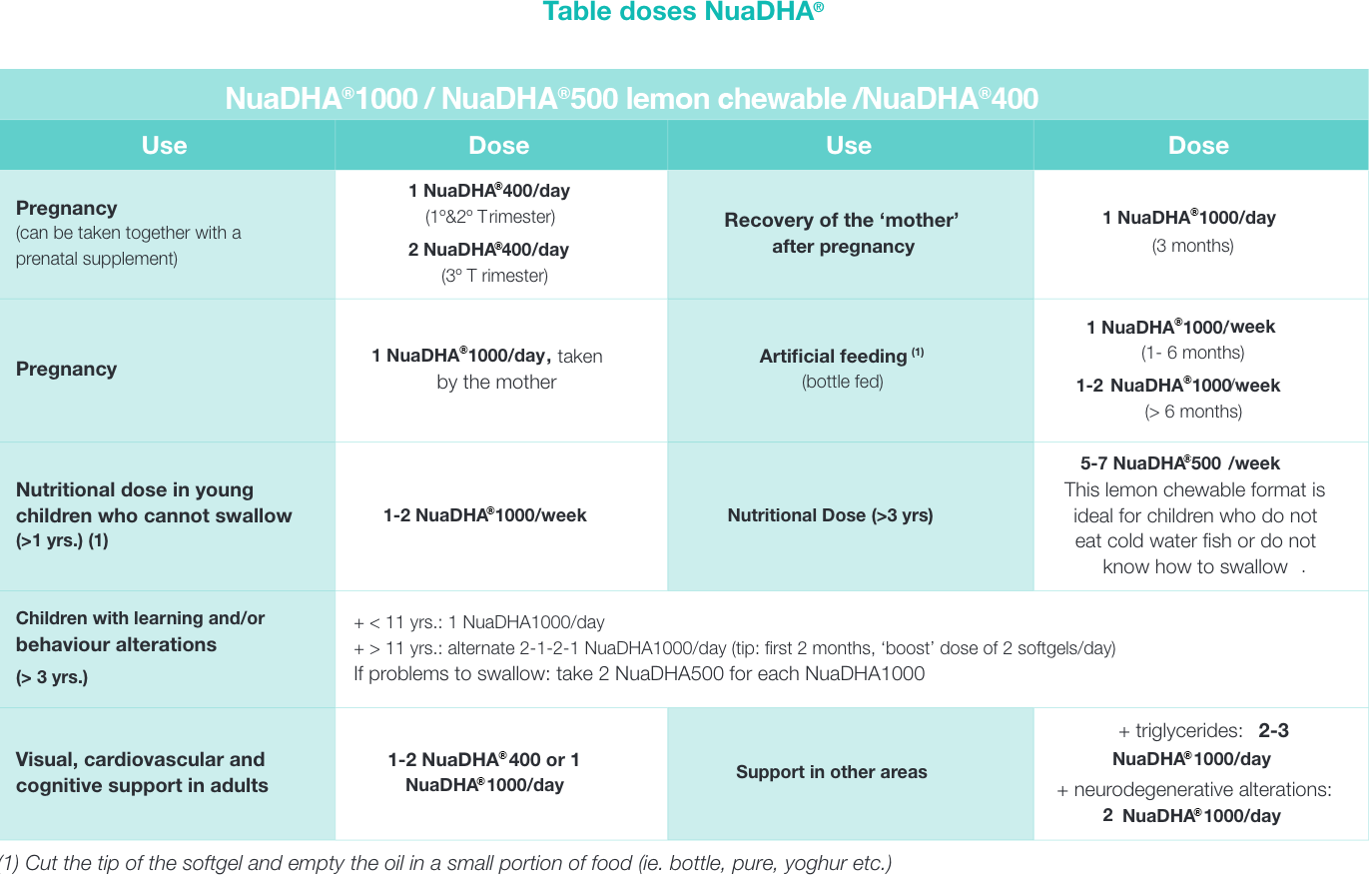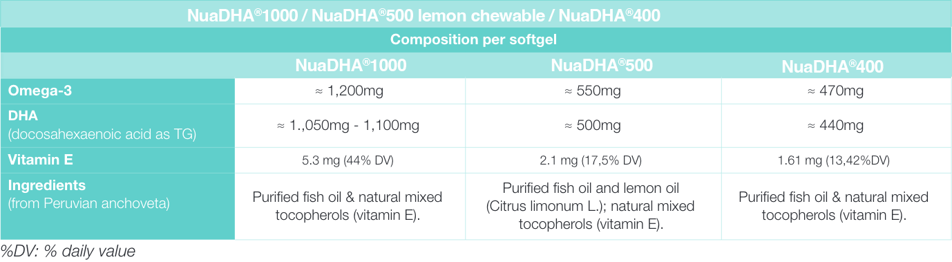 NuaDHA® and NuaEPA® offer the highest concentration of DHA and EPA per Softgel ( 1 softgel NuaDHA® 1000 = 3,5,10,15, 20 o more softgels of other omega-3 products).